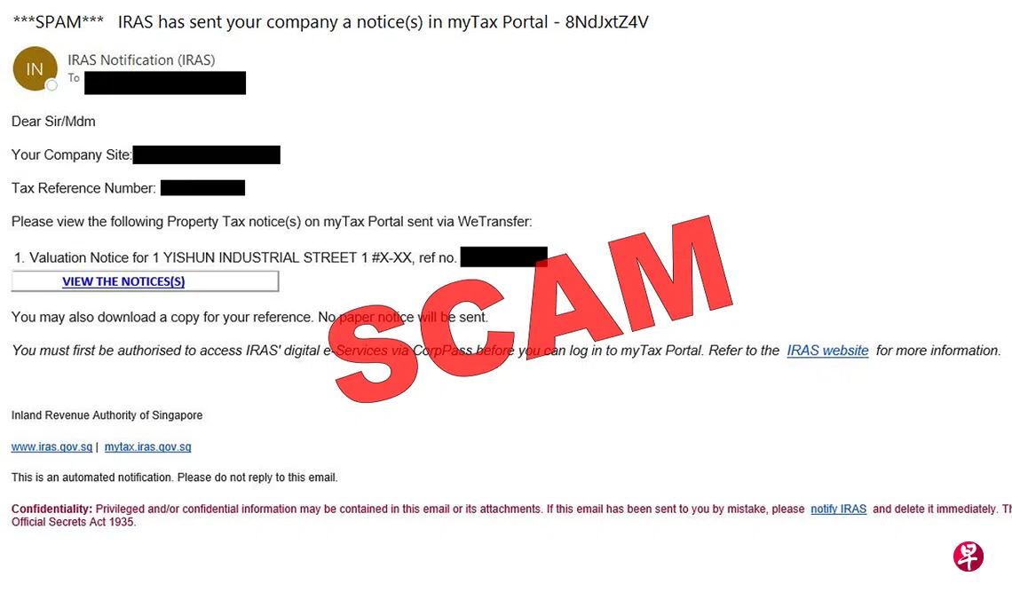 有不法之徒冒充新加坡国内税务局发电邮称房地产税通知已准备好供查看,实则里头附上的链接是钓鱼链接。当局也发文呼吁公众小心,切勿点击链接。