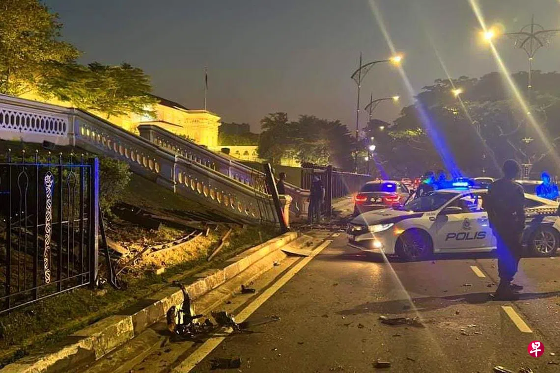 马来西亚新山发生命案,25岁青年被刺九刀后伤重不治,包括两名新加坡人在内的三名嫌犯在乘车逃逸过程中为躲避警方截查,慌乱间发生车祸,撞毁新山大王宫的篱笆后被捕。