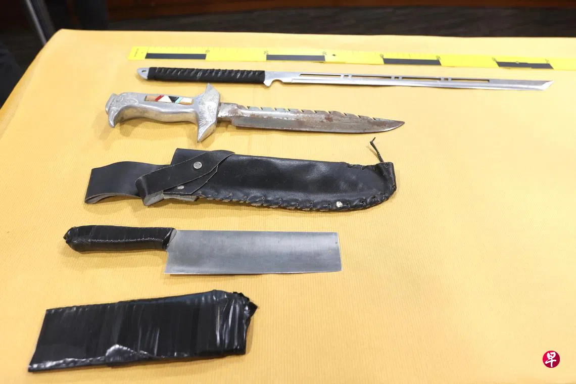 警员将男子制伏后,起获一个电击器、一把武士刀、两个指节套(knuckleduster)、各种吸毒用具,还有冰毒、海洛因等毒品。