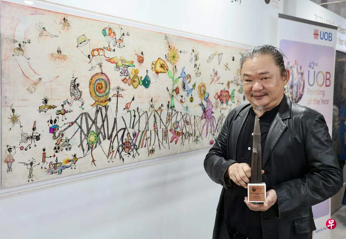 51岁的艺术家邢万和以混合媒介《格列佛游记》,获颁2023年度第42届大华银行全国绘画比赛新加坡资深画家组最佳画作大奖,赢得2万5000美元(约3万3885新元)奖金。本届东南亚最佳画作奖由26岁的泰国艺术家帕恰亚·查伦舒克(Pratchaya Charernsook)夺得。