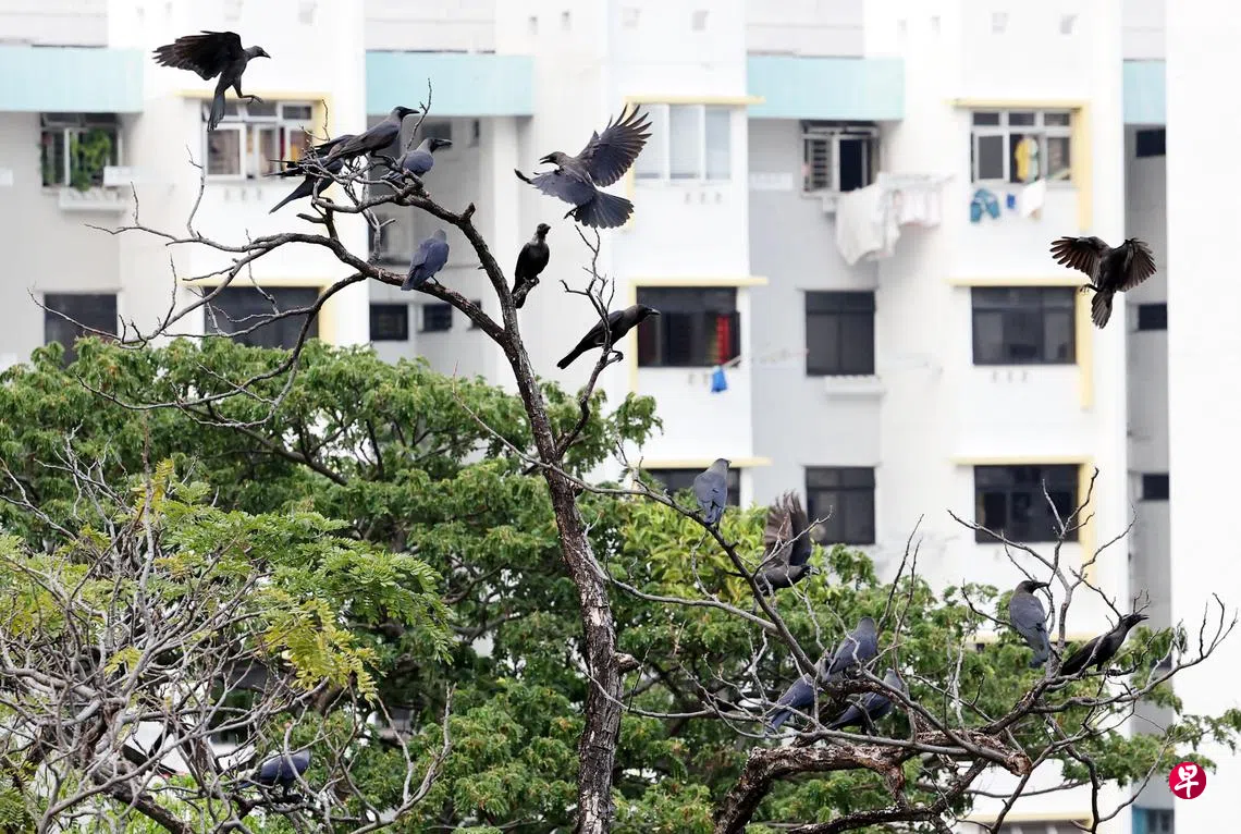受访居民透露,大概早上7时到11时左右,乌鸦群一般会在50A座熟食中心附近的组屋觅食。