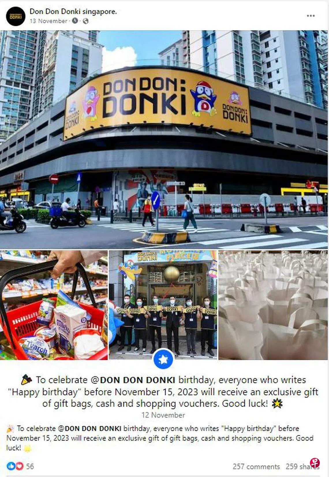 假冒账号星期一(11月13日)出现,并在当天上午发布虚假促销信息,称为庆祝超市生日,所有在星期三(15日)前在该贴文下留言“生日快乐”的网民,均可获得包括礼包、现金和购物券的特别礼物。