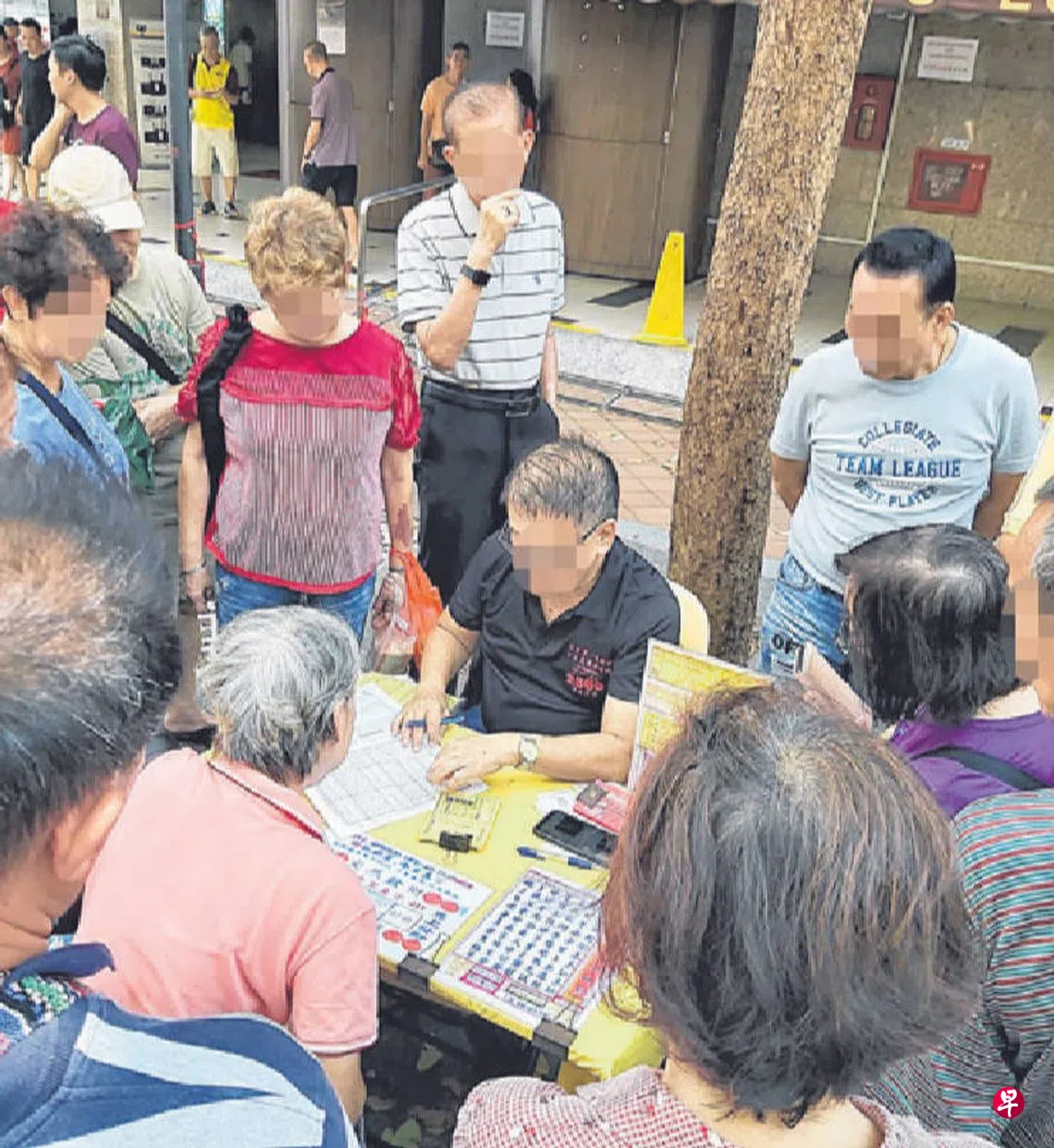 根据视频,超过20人围绕着桌子,穿着黑衣的阿伯给了一名阿婆一个万字票号码,阿婆付款2元后离开,另一名阿婆则接着坐下要“真字”。