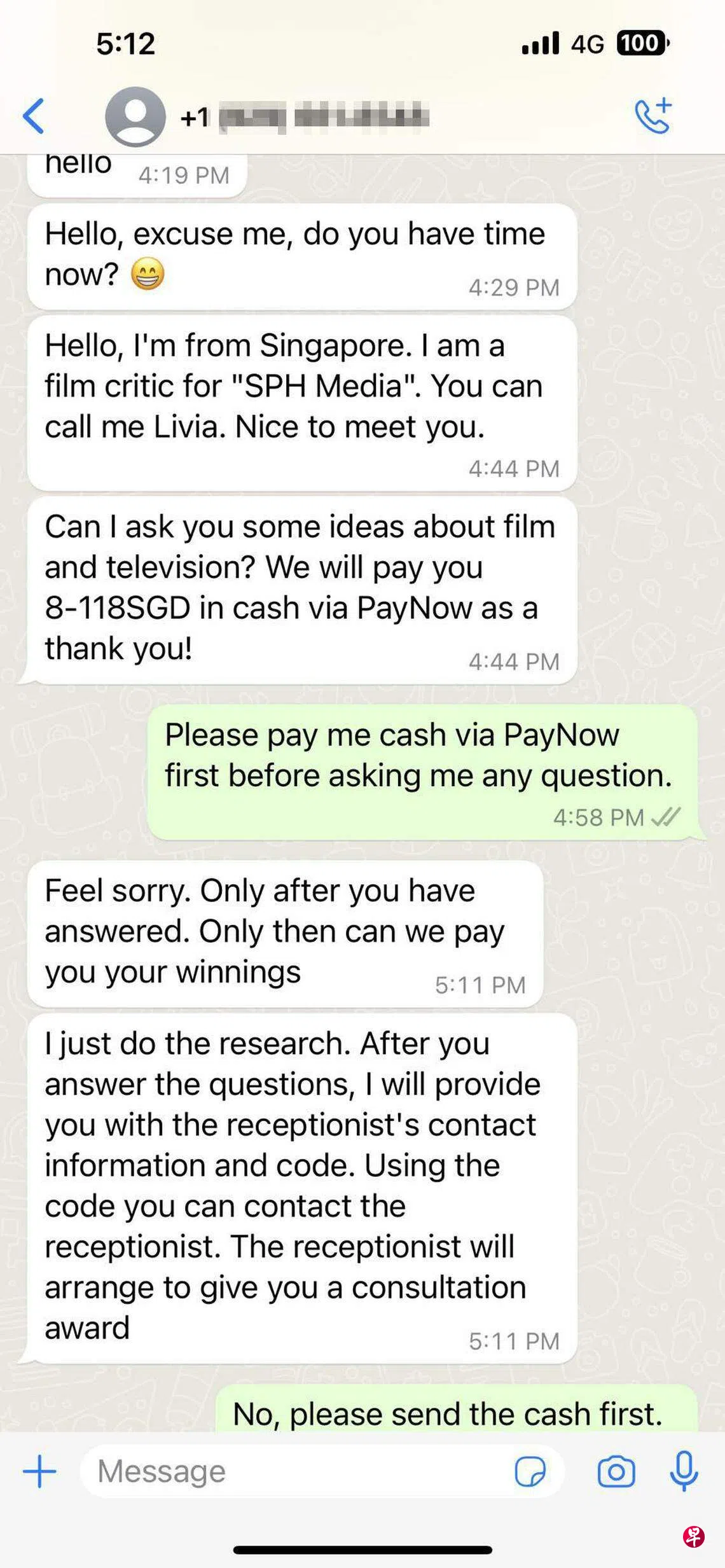 有公众在脸书发文,称自己在WhatsApp收到参加有偿问卷调查的邀请。对方自称是来自新报业媒体(SPH Media)的影评人,希望收到信息的公众可以针对电视电影发表一些意见,随后可通过PayNow收到八元至118元不等的佣金奖励。