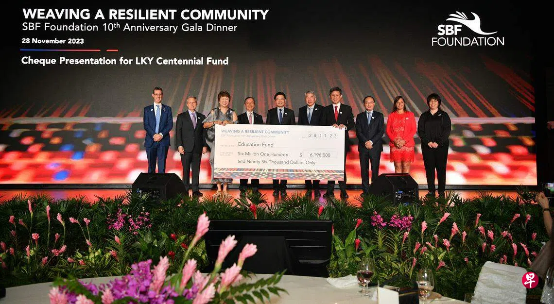 三、SBF与基金会连同多个商会和本地企业捐款619万6000元给李光耀百年树人基金(Lee Kuan Yew Centennial Fund)。捐款机构包括美国商会、英国商会、中资企业(新加坡)协会(China Enterprises Association)、欧洲商会以及新加坡国际商会。支票由基金会副主席洪月霞交予教育部长陈振声。