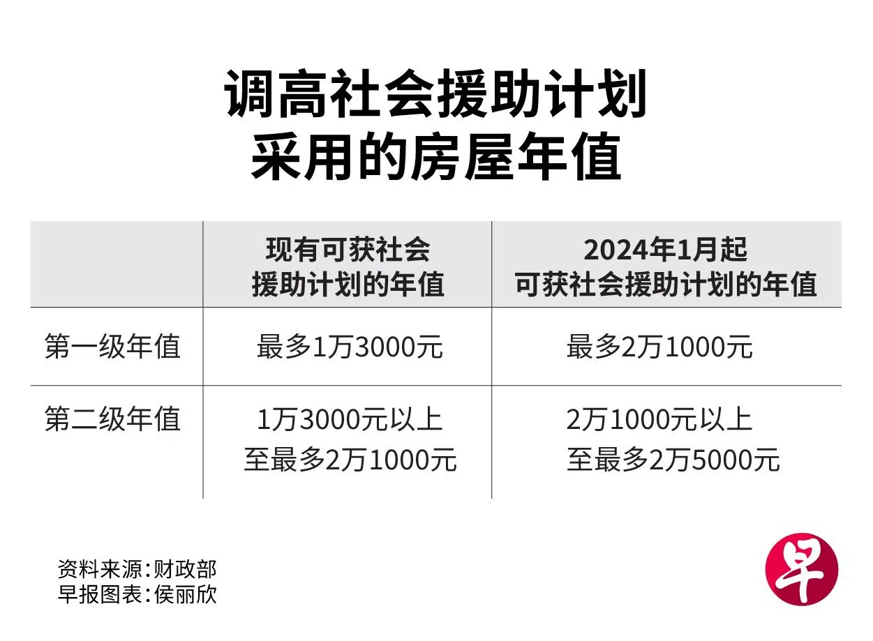 为确保有更大需求的国人继续获得资助,政府也将提高社会援助计划中采用的房屋年值门槛,自2024年1月1日起生效。