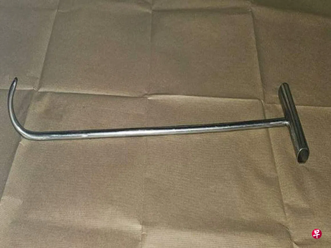 受害者拒绝配合,两人发生拉扯搏斗,导致金链断裂。嫌犯见无法得逞马上逃离现场,留下剔骨钩。