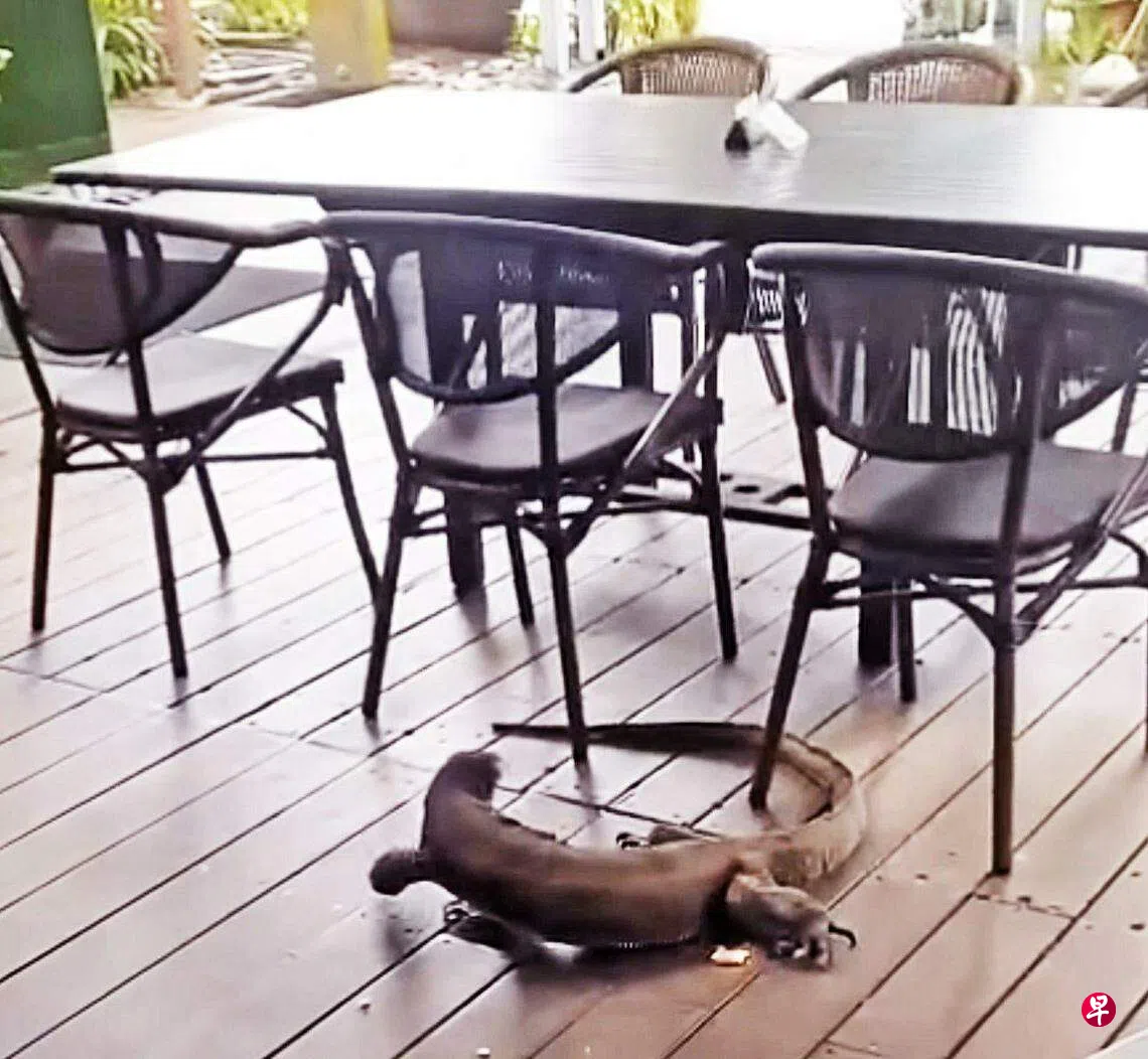 近日有人拍下圣淘沙一间咖啡座的户外用餐区,有一只体型庞大的四脚蛇在桌椅之间爬行。