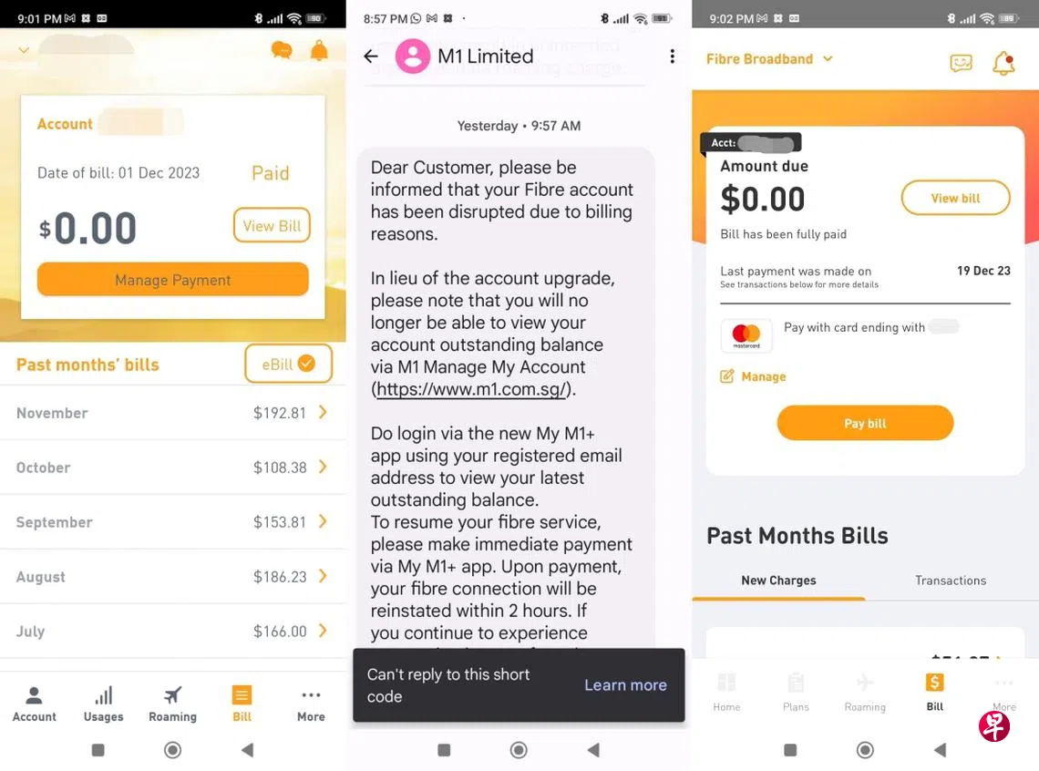 平时居家办公的蔡溆晖(49岁,自雇)向《联合早报》申诉,他于星期二(12月19日)早上9时57分收到M1的手机简讯,通知他由于“账单原因”,他的光纤宽带账户中断,并提醒他立即付清账单。不过,他当下以为是诈骗短信,没有放在心上。
