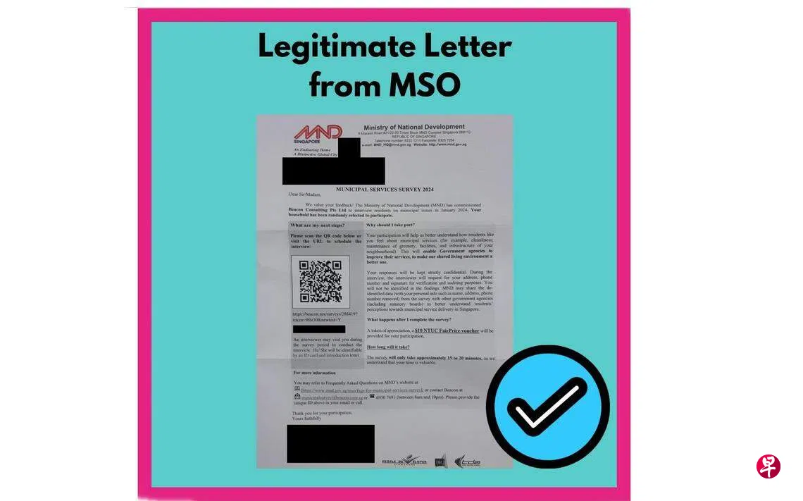 社区事务署(Municipal Services Office)星期五(12月29日)在脸书上贴文指出,近来有一些社交媒体帖子称,一封以“2024年社区事务调查”(Municipal Services Survey 2024)为题的通知信可能同骗局有关。