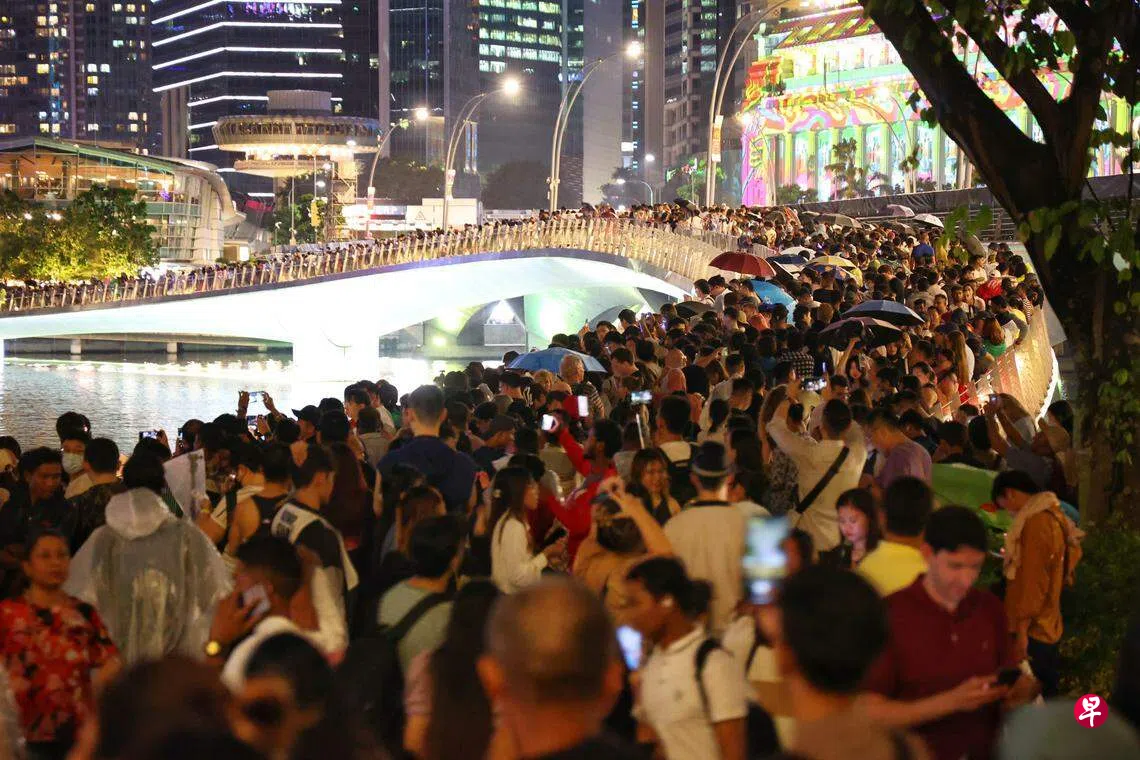 滨海湾跨年庆祝活动因人潮过度拥挤,警方暂时关闭滨海湾鱼尾狮公园、富丽敦一号(One Fullerton)、金禧桥(Jubilee Bridge)和青奥运公园(Youth Olympic Park)。