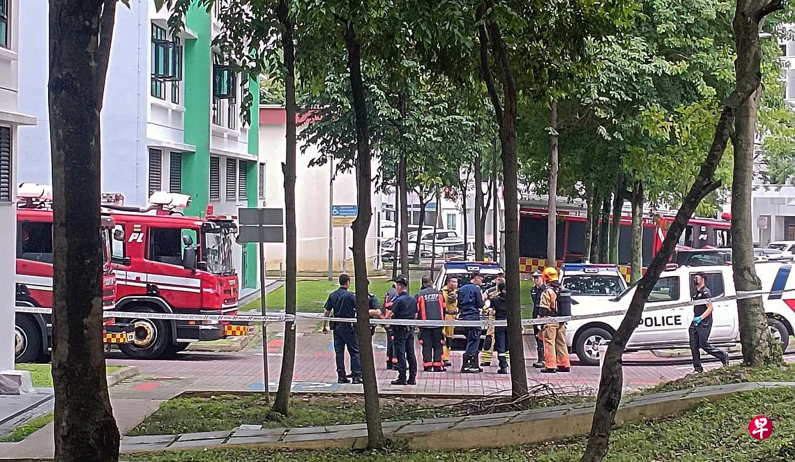 记者赶往现场时,组屋楼下停着多辆消防车和警车,底层拉起了封锁线,多名被疏散的居民在楼下的空地议论纷纷,等候当局人员给予指示。