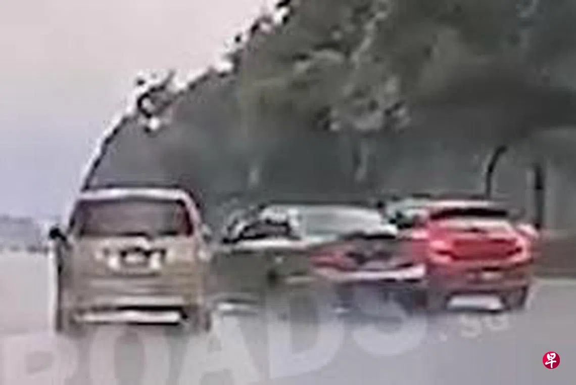 根据脸书专页ROADS.sg上载时长24秒的视频显示,一辆在第二条车道行驶的红色轿车快速地驶到褐灰色轿车的后方,跟着紧急刹车后就切入第一条车道欲超车。
