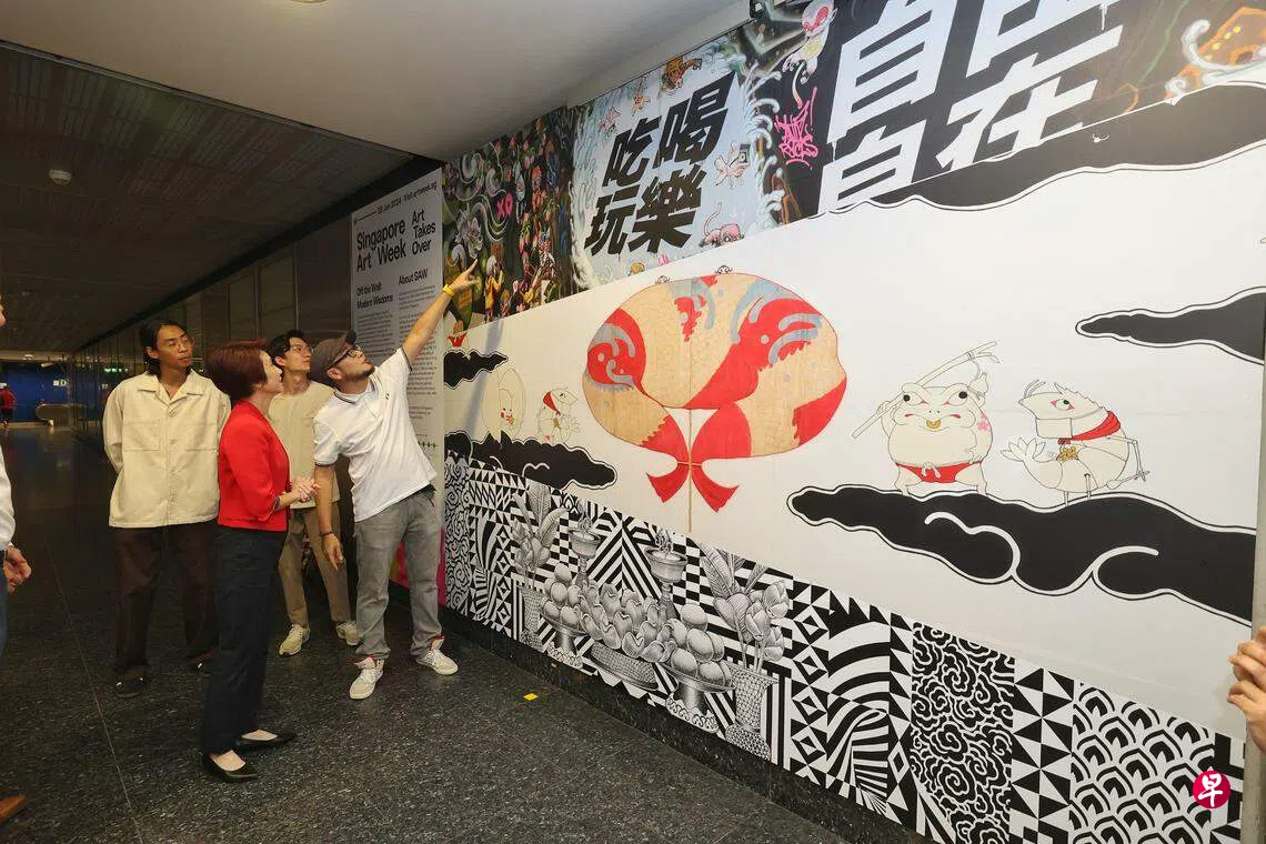 贸工部兼文化、社区及青年部政务部长刘燕玲星期一(1月8日)分别到港湾站和多美歌站参观艺术作品,并与艺术家互动交流。
