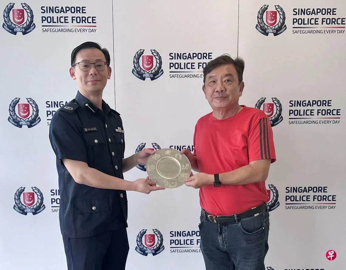 邱海坤见义勇为制止嫌犯逃逸,于2023年12月26日从机场警署副署长李良财副助理警察总监手中接获公共精神奖。