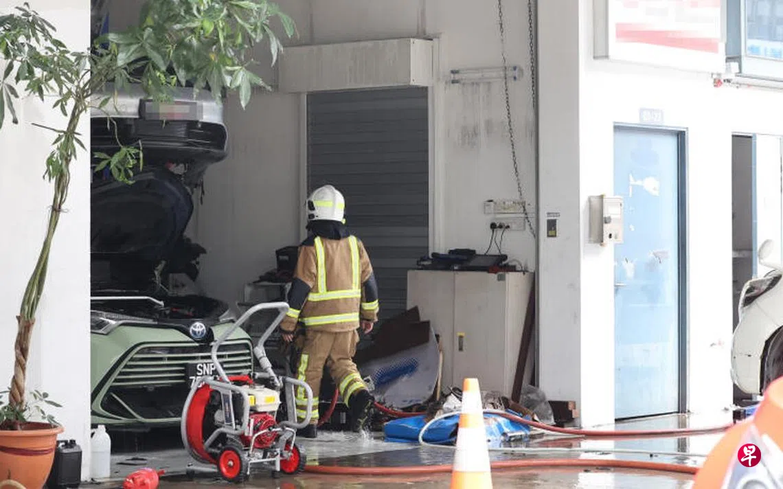 加基武吉修车厂发生火患,疑送修的保时捷电动车起火,现场传出爆破声。