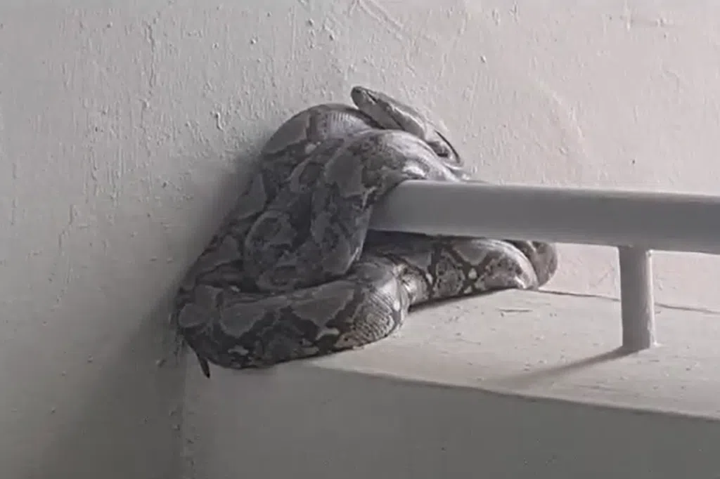 后港组屋惊现巨蟒卡在沟渠里,当局人员耗时五小时,撬开水泥,才救出巨蟒。