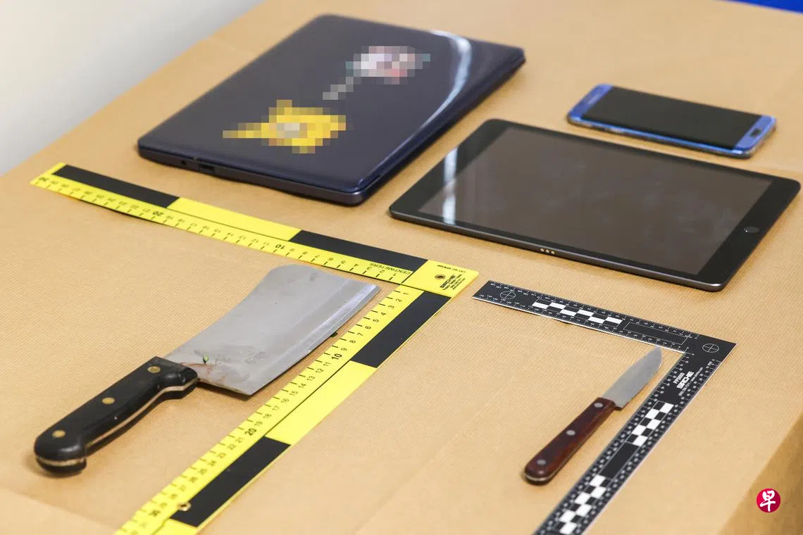 记者会上,警方也展示了起获的证物,其中包括一把菜刀、一把小刀、电脑、iPad和手机等。