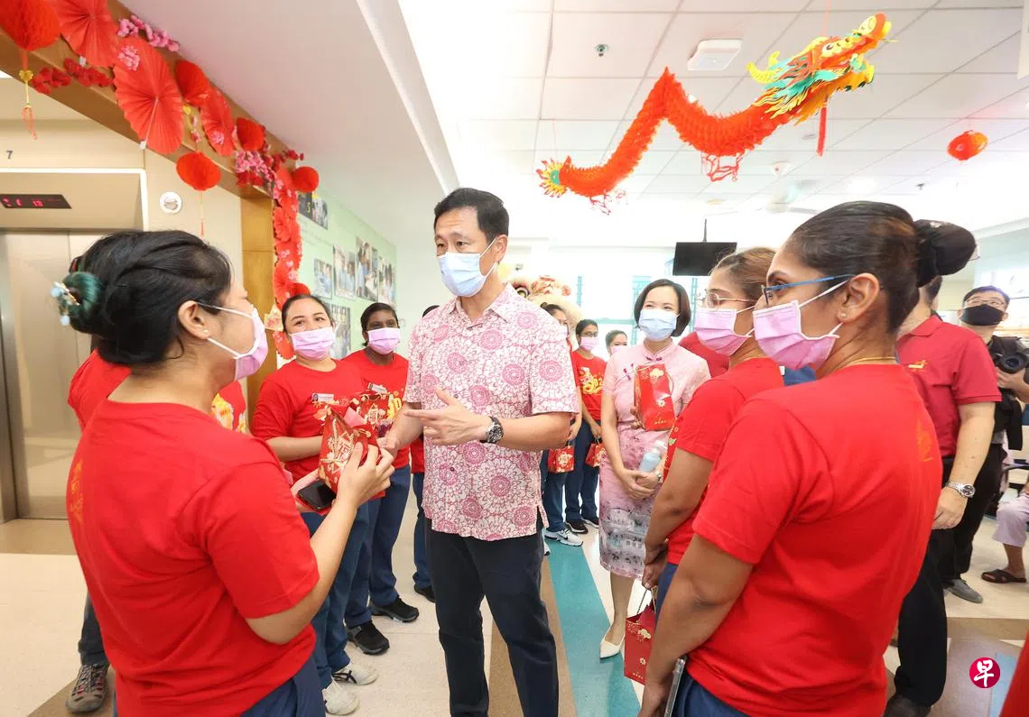 在大年初一走访公共医院,是卫生部长历年来的传统。王乙康在观看医护人员呈现的贺岁小节目后,到5C病房慰问病患及值班的医护人员。他与来自菲律宾、缅甸及中国等地的外籍护士亲切交谈时,还不时询问她们是否已在申请新加坡永久居民。