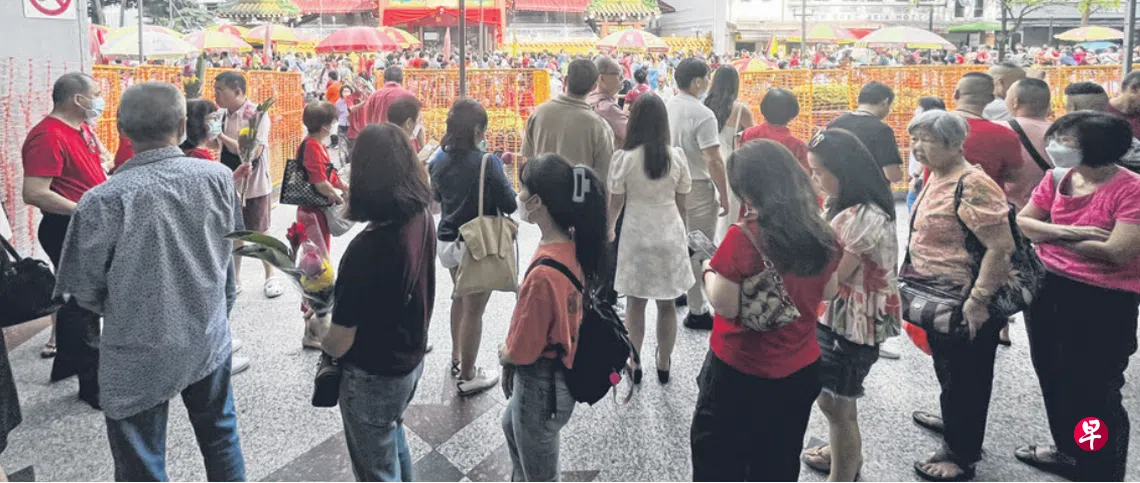 大年初一(2月10日)早上,数千人涌现四马路观音堂,排队的善信人龙一度延伸到对面组屋楼下,要入堂一度需要排约半小时。
