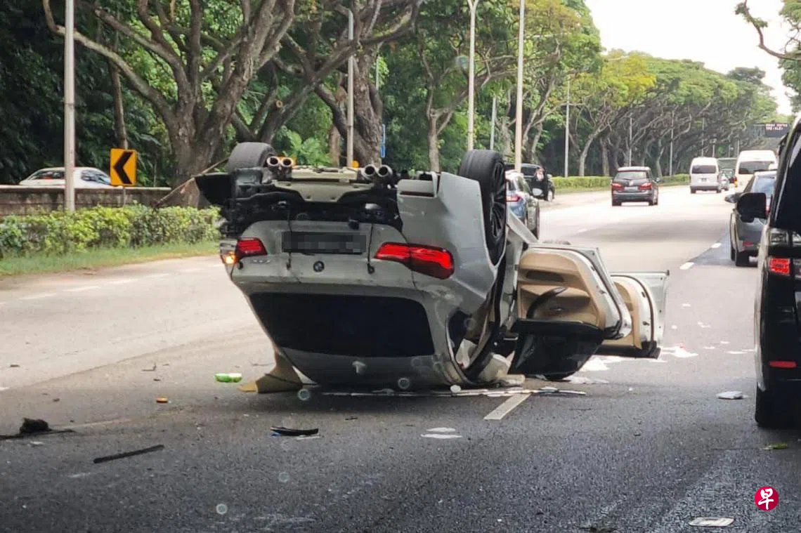 事发后有读者发视频给《新明日报》,指上述地点发生车祸。根据视频,一辆银色轿车侧翻在路旁,车内的安全气囊已弹出,右边侧镜则脱落在一旁。另一辆白色宝马则停在第二车道上,整辆车已“四轮朝天”,车顶严重受损,两侧门都被打开。