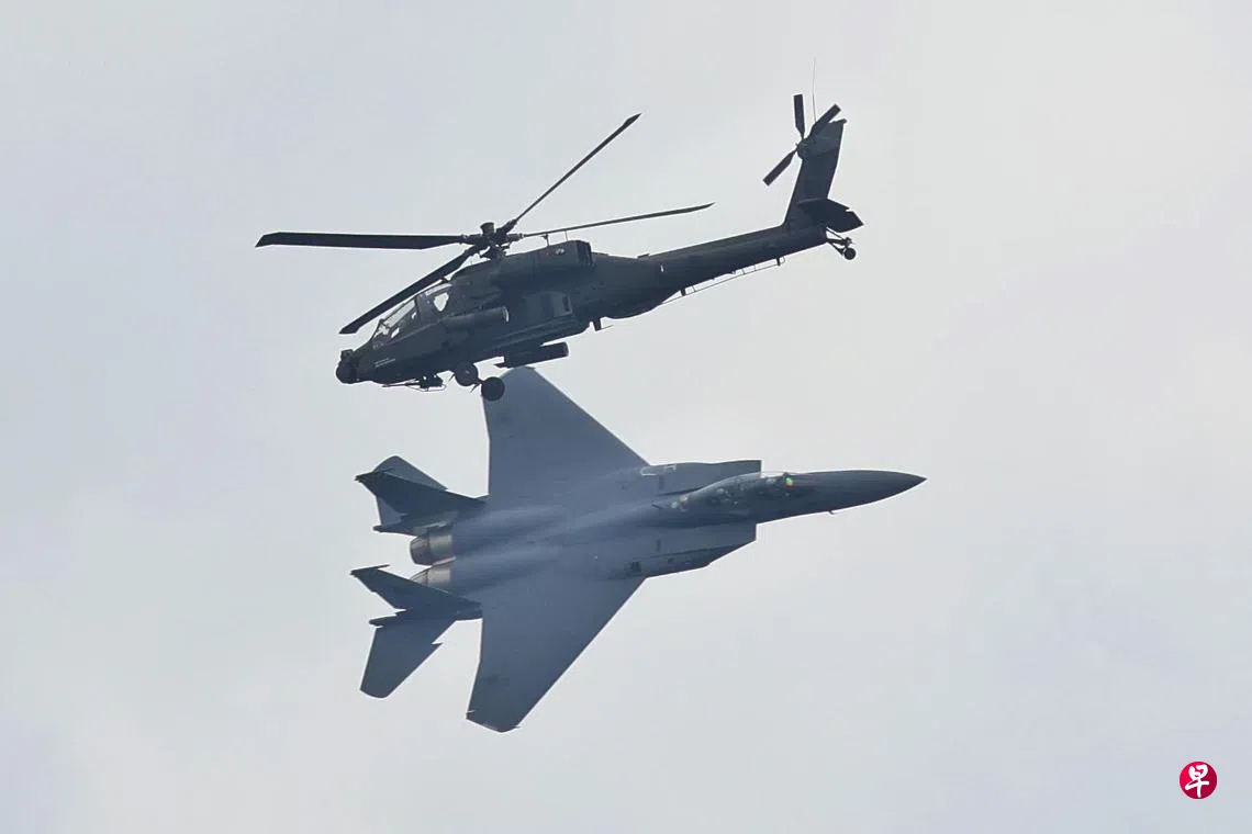 我国空军今年共派出一架F-15SG战机,以及一架AH-64D阿帕奇直升机,表演12组空中特技动作,包括两组新动作。