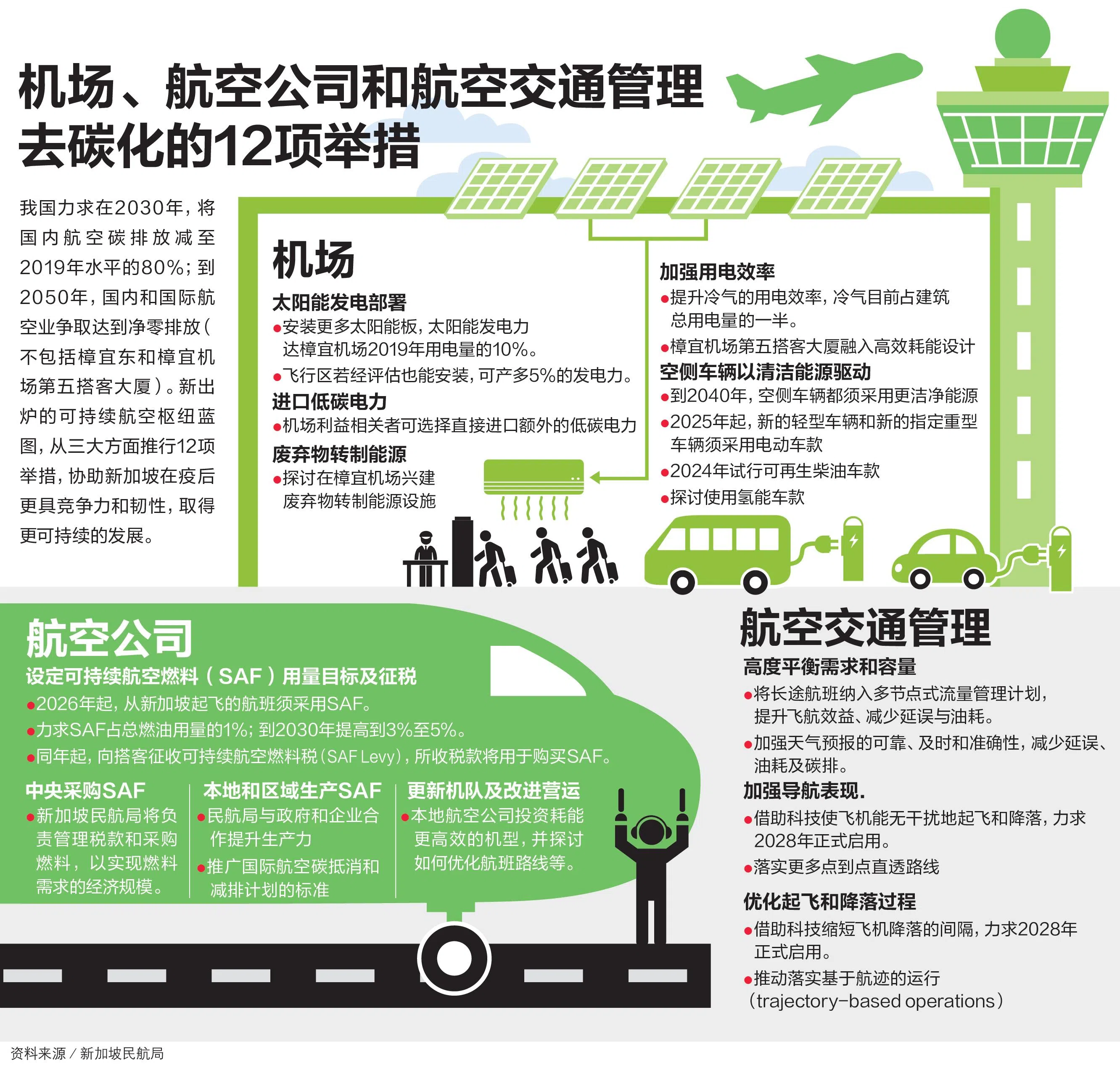 新加坡民航局将与利益相关者合作,在2030年,把机场运作产生的排放量在2019年的基础上减少20%,并且到2050年实现国内和国际航空业净零排放(不包括樟宜东和樟宜机场第五搭客大厦)。