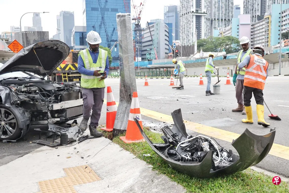一辆马赛地在欧南园行驶途中,疑失控撞倒交通灯灯柱,一度引发交通堵塞。
