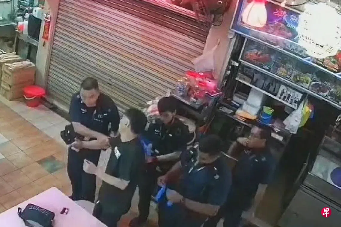 根据附近摊位提供给《新明日报》的闭路电视画面,数名警员对一名男子问话搜身后,在他身上找到一把超过10公分的刀子和一根管子。