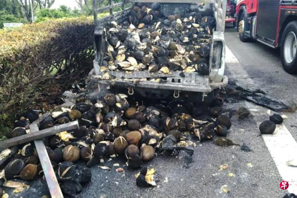 短短一小时内,两起火烧车事故,一辆回收卡车和一辆小罗厘被烧毁,小罗厘上的榴梿被烧得焦黑。
