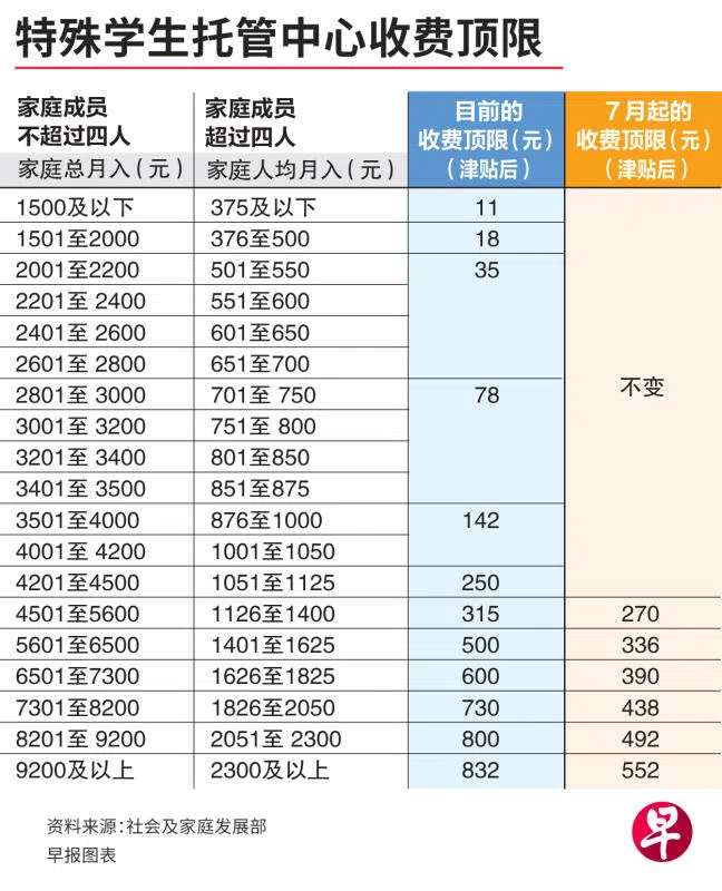 目前,特殊学生托管中心的收费不能超过允许的顶限,较低收入的家庭获取较高的津贴。接下来,收费调整将协助更多中等收入家庭减轻开销。以家庭月入超过9200元的家庭为例,他们目前每月支付的费用可高达832元,接下来将减至552元。