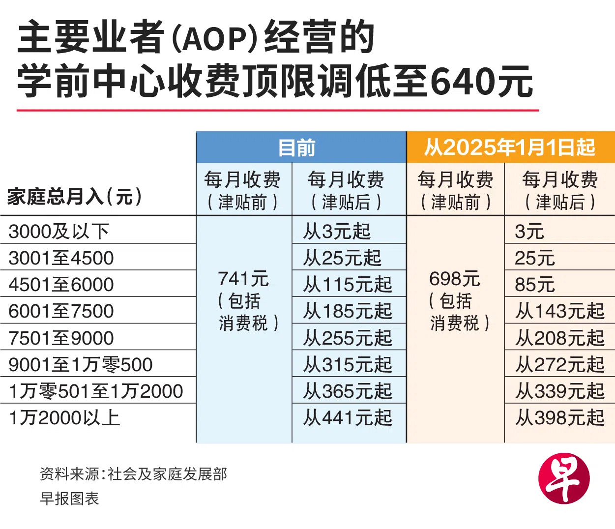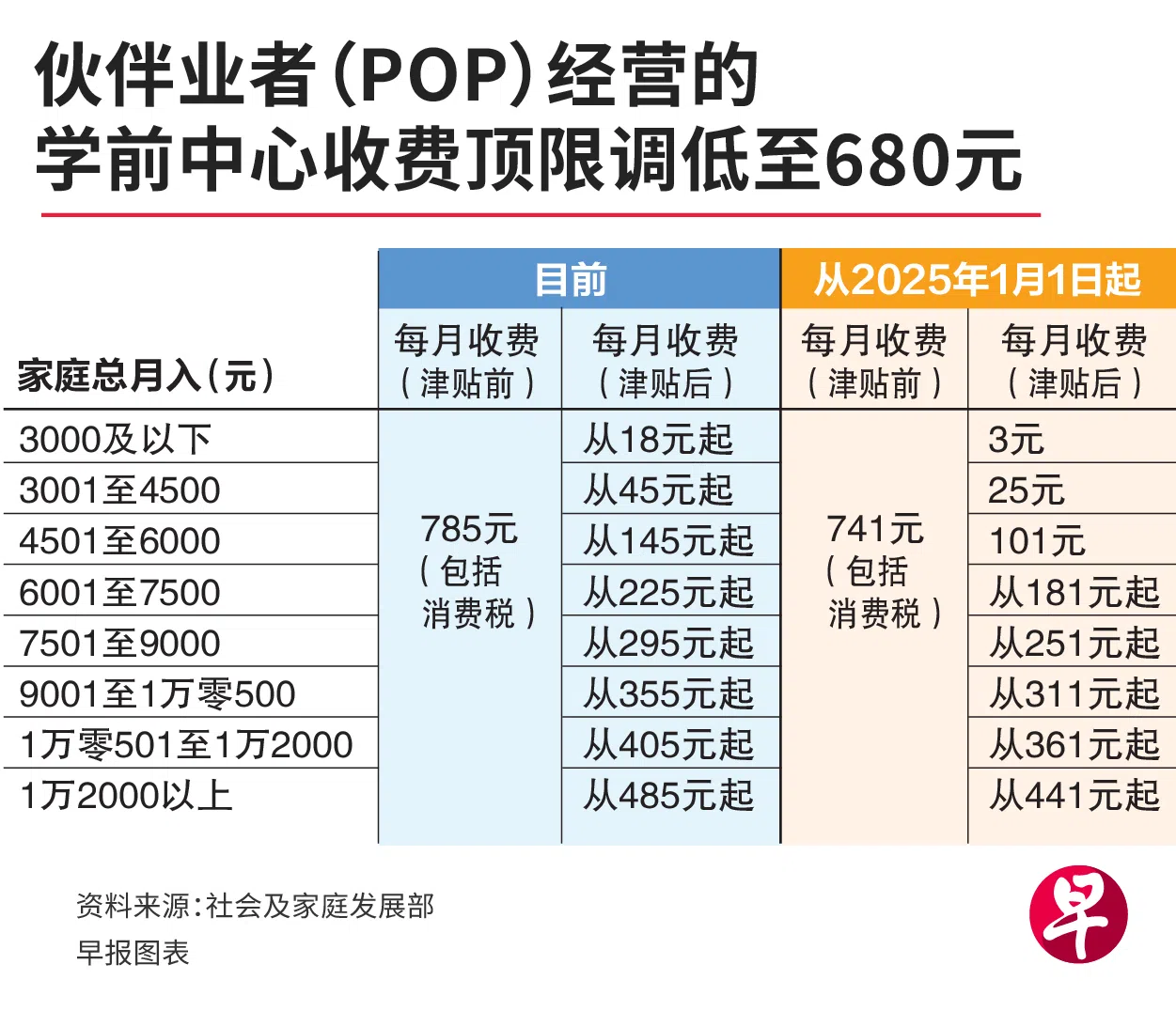 从明年1月起,主要业者和伙伴业者经营的学前中心每月收费顶限各减40元,全日制托儿服务的收费顶限分别降至640元和680元。扣除津贴,家庭月入在3000元及以下的低收入家庭每月只须支付3元。