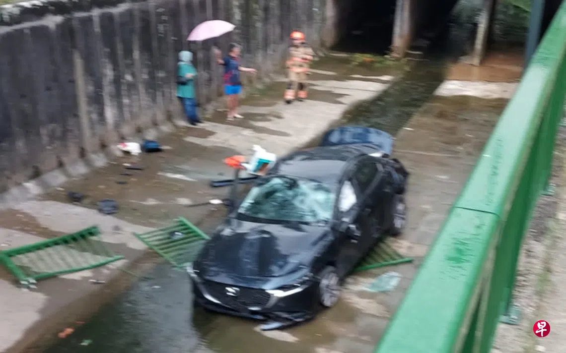 这起事故发生于星期三(3月6日),地点在武吉巴督西2道前往武吉巴督中路的路段。根据读者传来的照片显示,一辆黑色马自达将沟渠栏杆撞碎,随即坠入沟渠中央。
