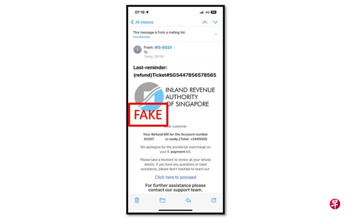 新加坡警察部队星期三(3月6日)发文告说,这类骗案的受害者会收到冒充国内税务局(IRAS)发来的电邮,指受害者之前多缴费用,能获得退税。电邮也会附上一个网站链接,受害者若点击链接,就会被转接到一个冒充国内税务局的钓鱼网站,以便选择从转账卡或信用卡的方式退款。