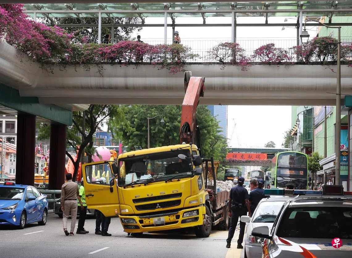 另一名在附近工作的盘先生(27岁)也说,相信是司机忘了把吊臂收起来,经过撞上天桥,才会有碰撞的巨响。