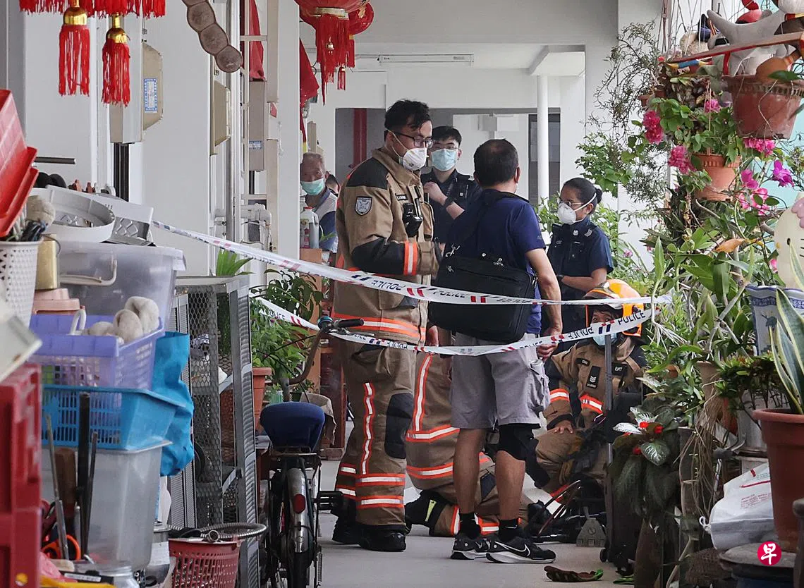 组屋单位流出恶臭尸水,岂料大门开不了锁,惊动民防人员破门而入,揭发76岁老翁倒卧家中变腐尸。