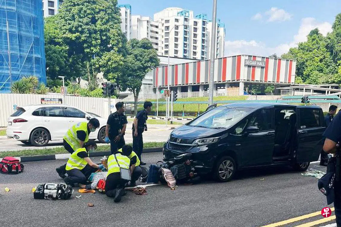 根据脸书专页SgRoadVigilante所上传的图片,画面显示一辆行动辅助工具被黑色轿车压着,已严重变形。一名骑乘行动辅助工具的女子躺在地上,四名救护人员当时正在协助帮忙。轿车右后方还有另外一辆行动辅助工具,地上满是碎片残骸。