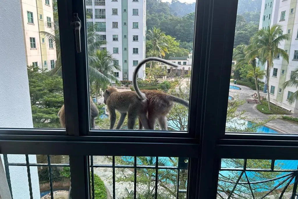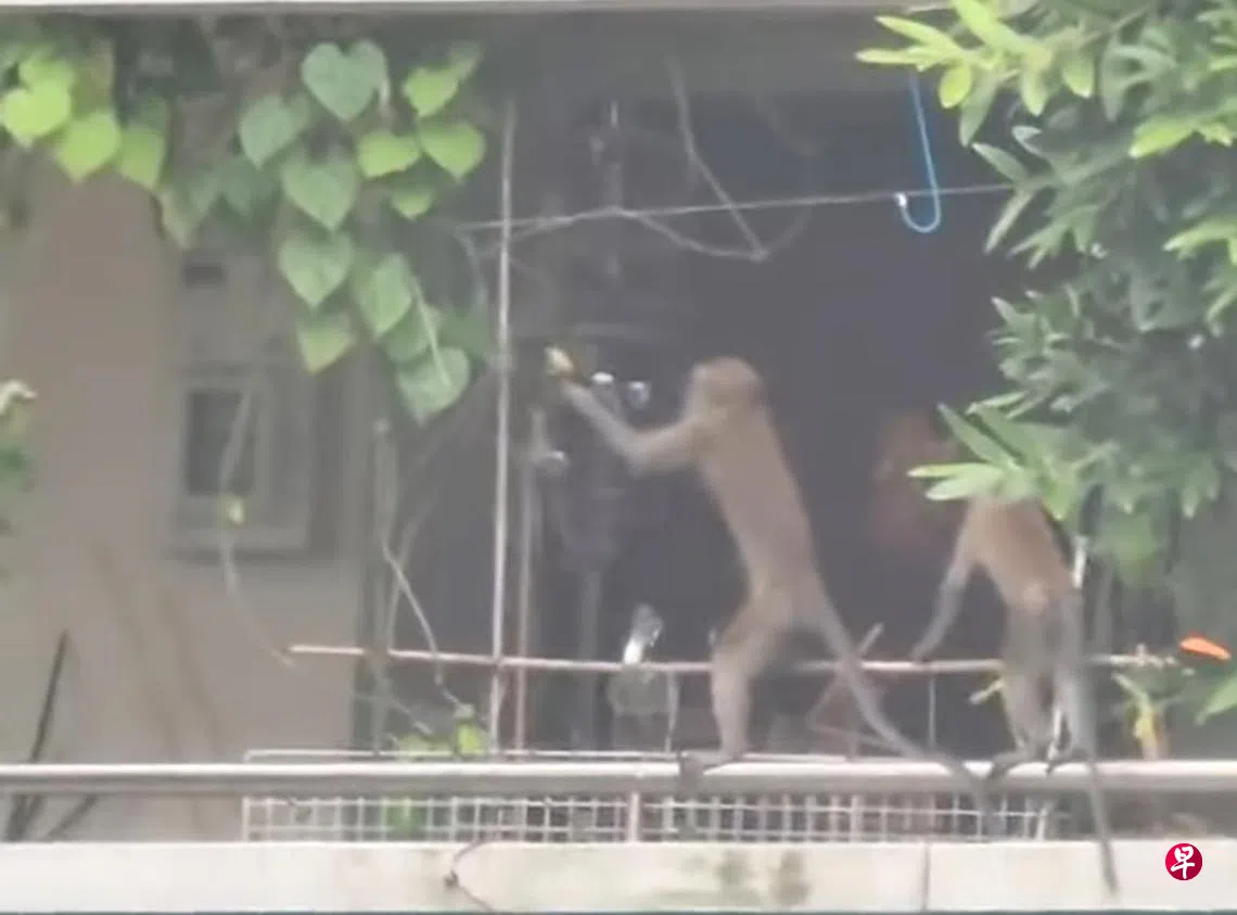 猴子站在组屋走廊栏杆,欲打开鸟笼抓小鸟,被网民拍下放上网。