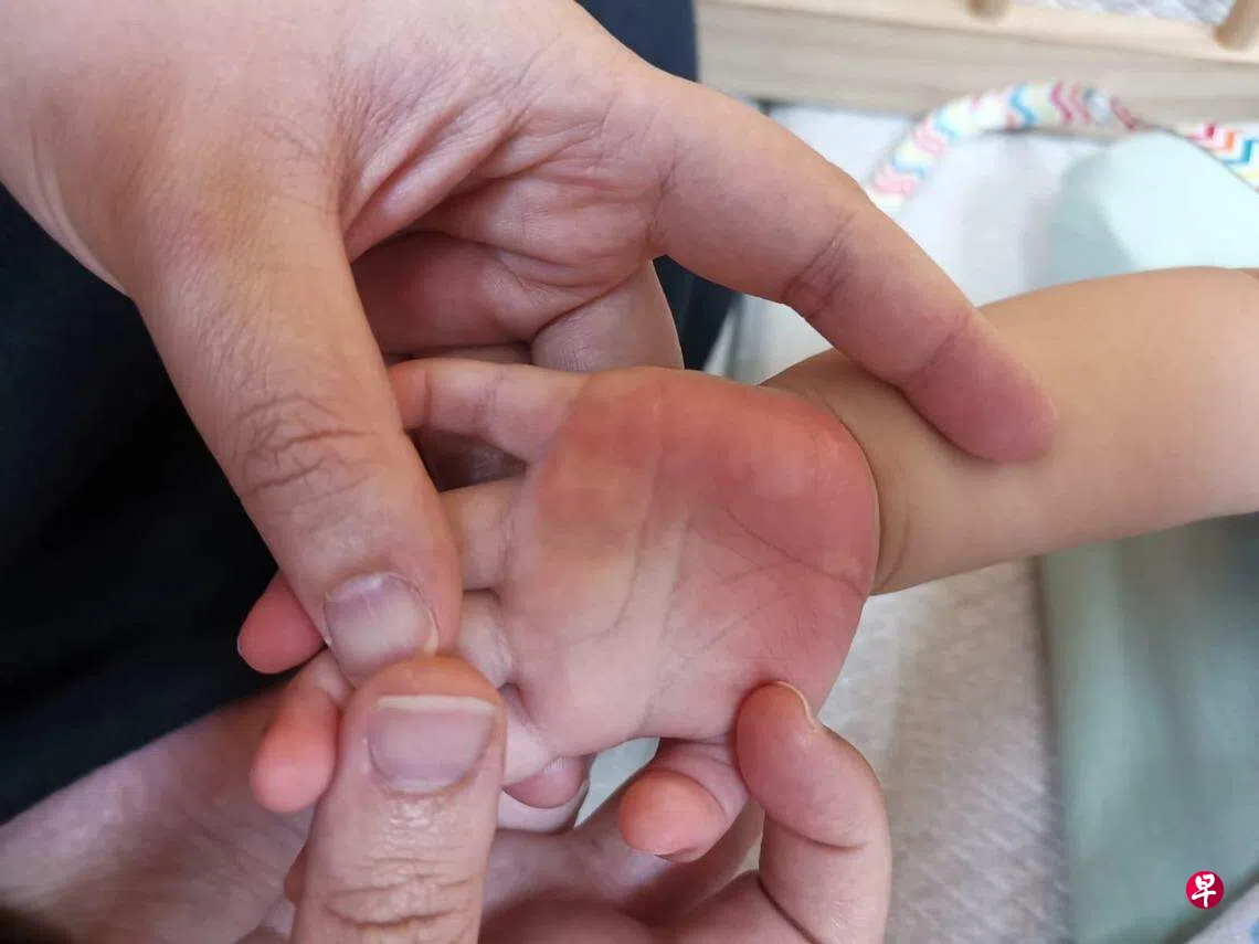 11个月大男宝宝在托婴中心后院爬行灼伤双手,母亲指中心职员疏失,幼儿培育署已对此展开调查。