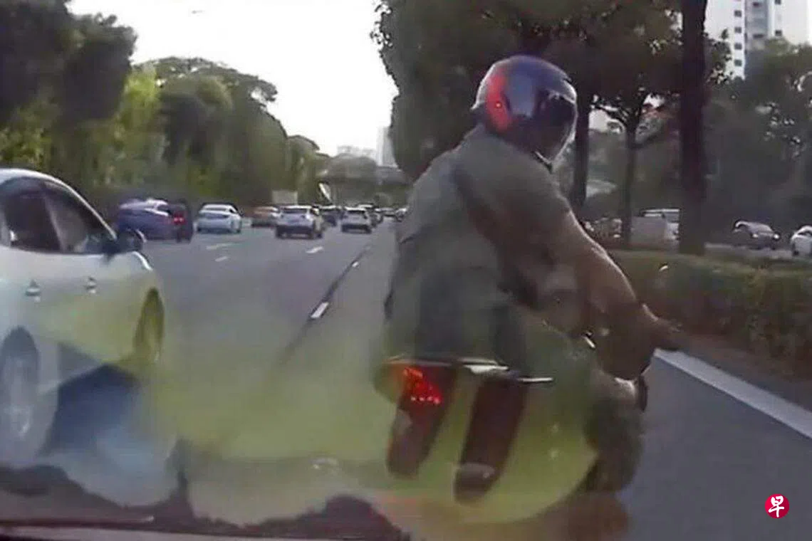 涉事汽车捕捉到的行车记录仪视频,于星期一(1日)在社交媒体传开。视频显示,3月28日,汽车和电单车正在泛岛快速公路行驶,疑似穿着武装部队制服的电单车骑士,因不满汽车转换车道而朝汽车比中指鸣笛。