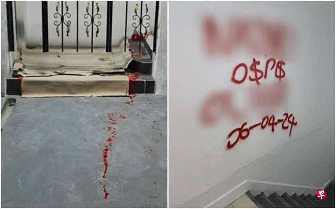 新加坡警察部队星期天(7日)发文告说,警方于星期六(6日)下午约6时50分接获报案,指淡滨尼22街一个组屋单位发生大耳窿骚扰案件,单位大门被泼红漆,楼梯口墙上还写下“欠钱还钱”的追债字句。