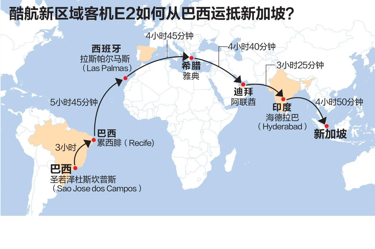 酷航接收的首架E190-E2型客机(简称E2)将在星期五(12日)从圣若泽杜斯坎普斯起飞,下星期一(15日)抵达新加坡樟宜机场。由于E2是个区域客机,飞行时间最长约六小时,因此途中须要在另五个城市降陆添油,同时让机组人员休息。