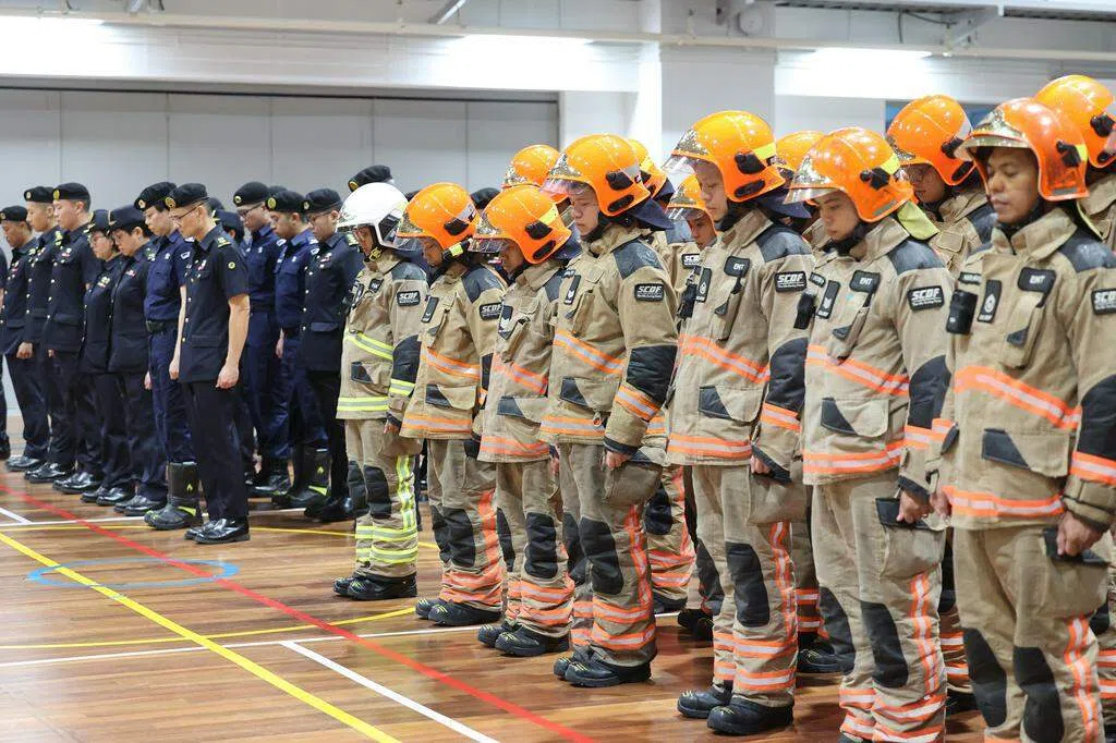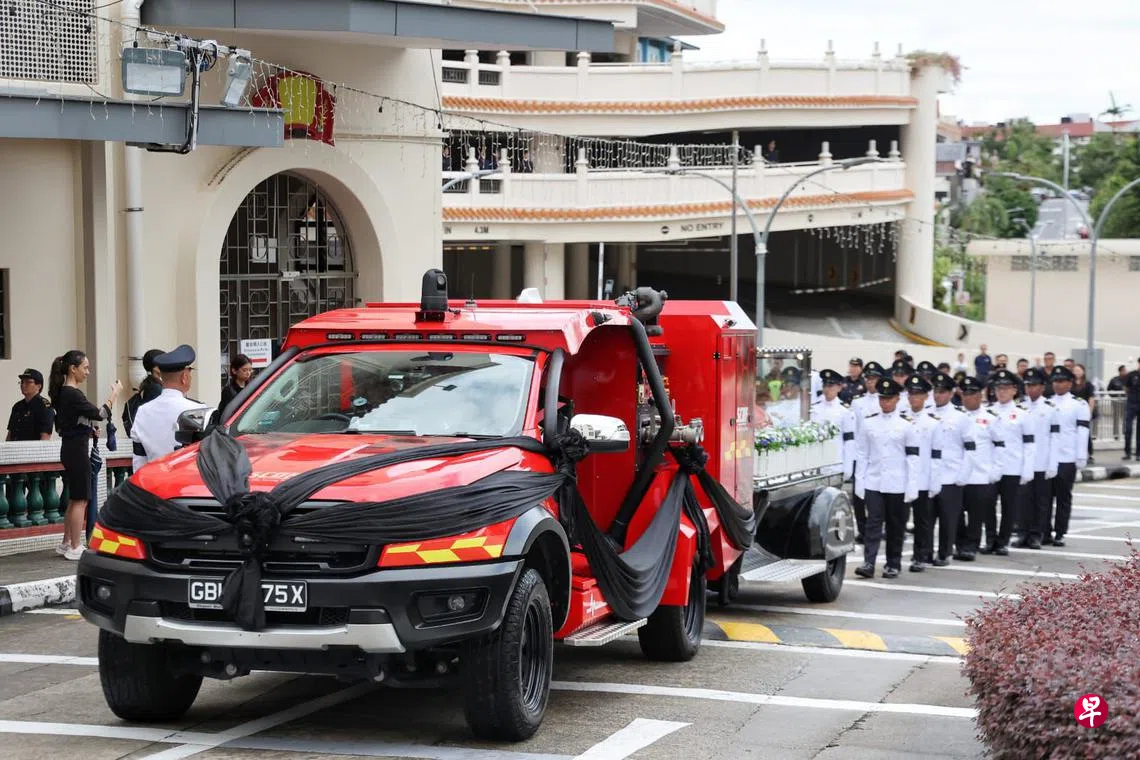 150名来自民防的同僚站在通往仪式厅的道路两旁,向灵柩行礼致敬,气氛庄严肃穆。