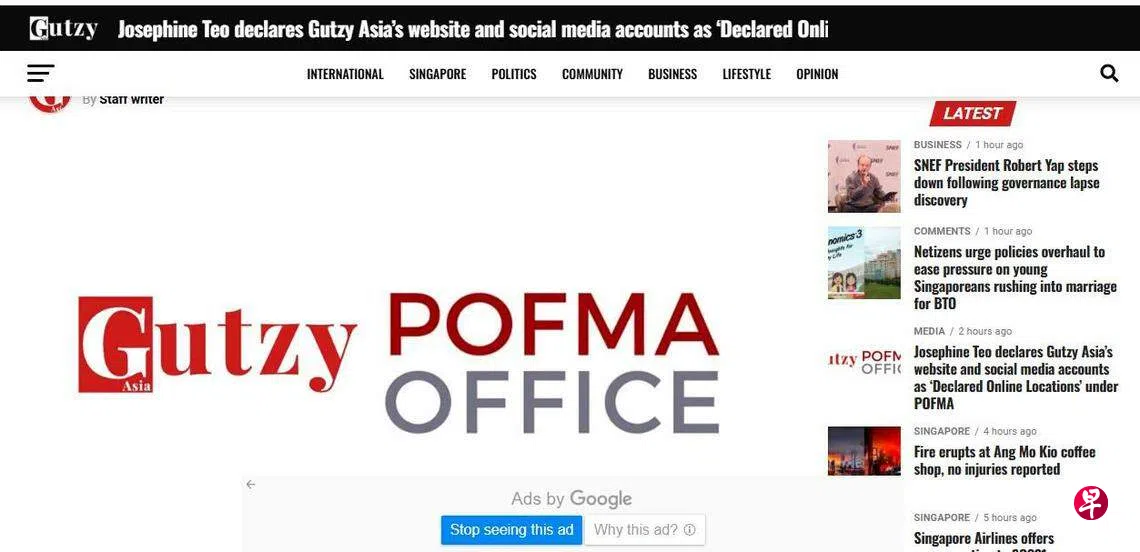 由于多次发布不实信息,网络新闻平台Gutzy Asia的网站和社媒专页,被通讯及新闻部长列为假信息源,禁止平台经营者从中营利。