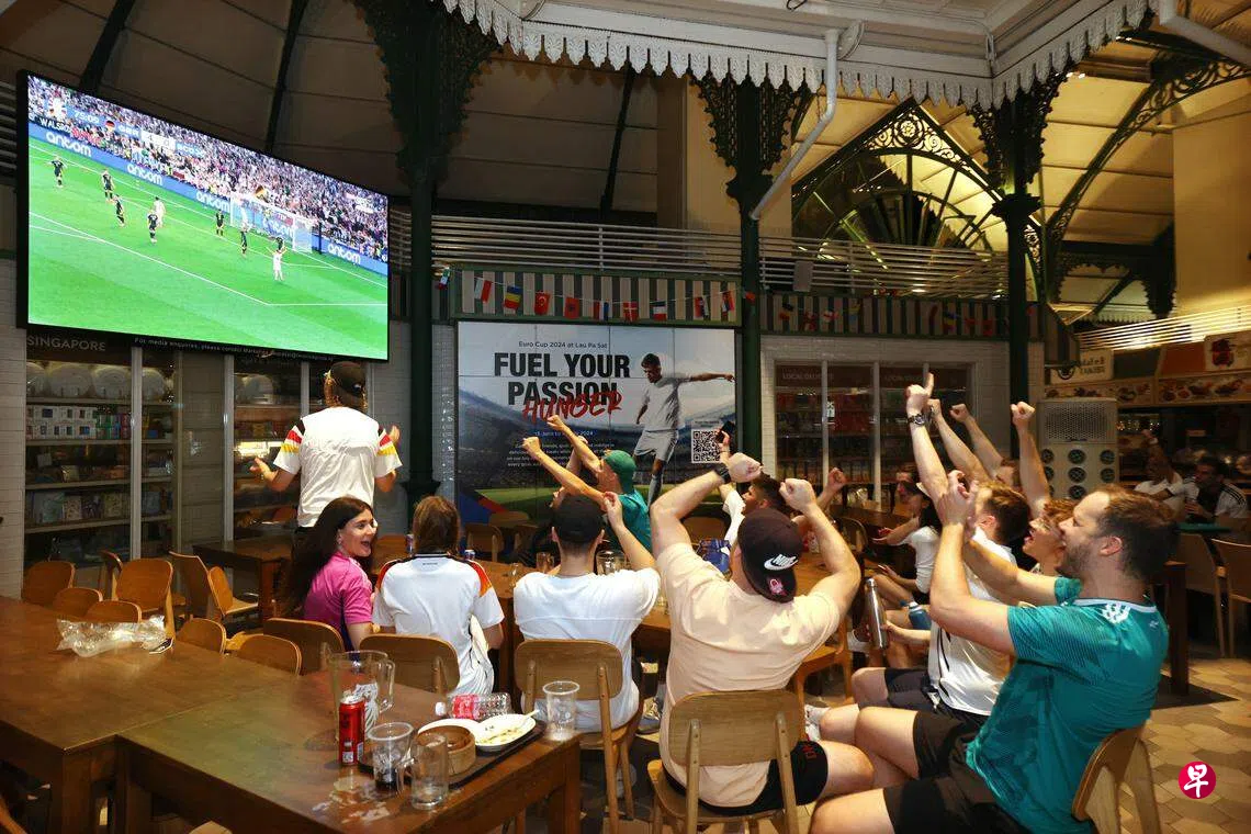 欧锦赛揭幕战由东道主德国对垒苏格兰,《联合早报》记者星期六凌晨走访位于兀里的Cafe Football酒吧,现场有近20名球迷。除了旅居本地的德国人,也有不少国人选择到酒吧看球,享用美食的同时也可以感受更浓厚的氛围。