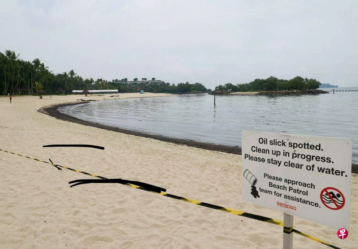 圣淘沙岛沙滩的水域出现大片油渍。海滩已关闭进行清理工作,并禁止人们进行水上活动。