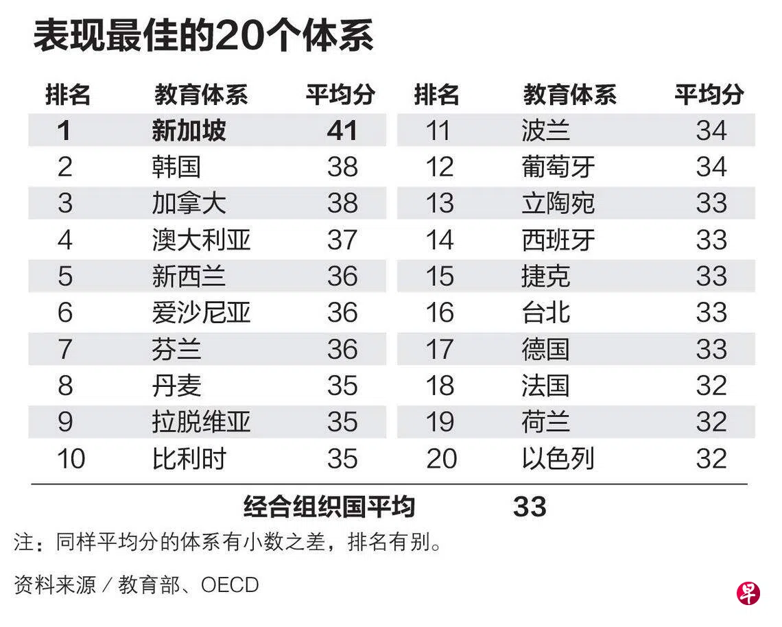 新加坡学生在创意思维项目取得41的平均分,高居第一,经合组织国平均分为33分,最高分为60分。韩国和加拿大分别排名第二和第三。