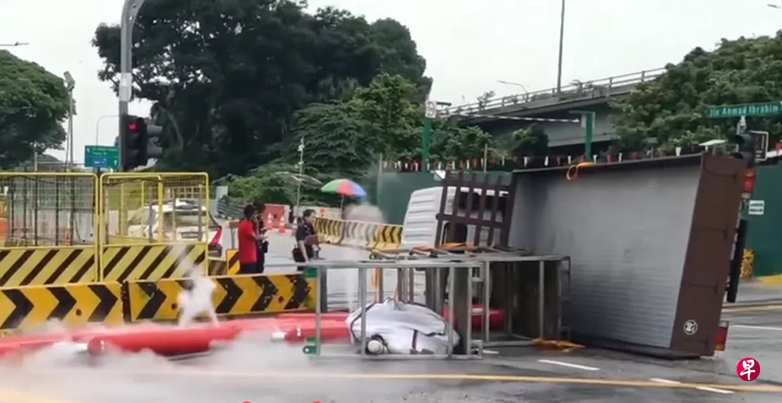 新加坡警察部队受询时指出,涉事罗厘疑打滑而翻覆。一名30岁男驾驶员正在协助警方调查。