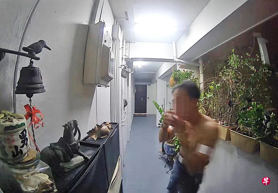 男子打着赤膊,腰间系上“佩剑”在组屋走廊游荡,还拍摄单位,引起居民担忧,警方已介入调查。