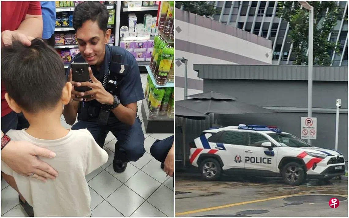 照片显示,至少有两辆警车停放在事发加油站,警员到商店内关切身穿白衣花裤的男童,并拍照做记录。公众也买来饮料给男童补充体力。